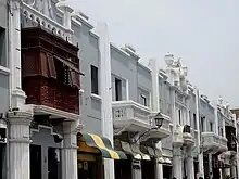 Colonial and republican architecture of the Paseo Pizarro one of the highest-traffic streets in the Historic Centre of Trujillo, at background is the historical and traditional Plazuela El Recreo and its high trees.
