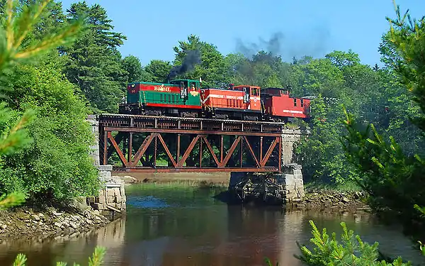 A pair of General Electric 70-ton diesel locomotives on the Belfast and Moosehead Lake Railroad, crossing the river heading inland from Belfast Bay.