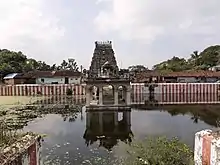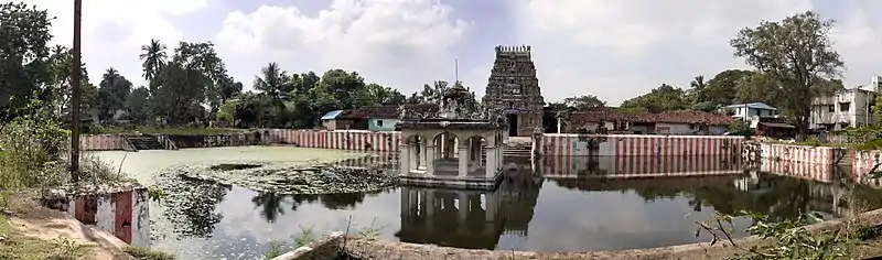 Pasupatheeswarar temple is located in Pandanallur, a village in the Tamil Nadu state highway SH150, on the Tirupanantal - Vaitheeswarankoil road, in the South Indian state of Tamil Nadu. The temple has a five-tiered rajagopuram, the entrance tower and all the shrines of the temple are enclosed in concentric rectangular granite walls. The temple covers an area of close to an 2 acres (0.81 ha). The temple has three prakarams (closed precincts of a temple) and many mandapams (halls). The temple faces east and is entered via the rajagopuram (gateway tower). The presiding deity in the form of lingam is housed in the sanctum. Following the legend, the image of the Lingam has a mark of the cow's hoof. The Lingam is white in colour and ablution is not performed for the presiding deity.[1] The attached hall, the ardhamandapa measures the same width as the sanctum, while its length is twice the sanctum. The ardhamandapa projects towards the east. The Mukhamandapa has a square structure. There are five devakoshtas that cover the exterior walls of the sanctum. The images of Dakshinamurthy and Brahma are the only ones remaining out of the five. The presiding deity of the temple is Pasupatheeswarar, housed in the sanctum. The consort Mangalambiga, is located in a south facing shrine.[1] The temple has four bodies of water associated with it. The principal water tank is called Kamadhenu Theertham, which is located outside the main entrance of the temple.[5]