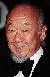 Morita gained particular fame during the 1980s for his work as Mr. Miyagi in the Karate Kid films. The original preferred choice was Toshiro Mifune, who had appeared in the Akira Kurosawa films Rashomon (1950), Seven Samurai (1954), and The Hidden Fortress (1958), but the actor did not speak English.[18] Morita later auditioned for the role, but was initially rejected for the part due to his close association with stand-up comedy, and with the character Arnold from Happy Days.[18] Producer Jerry Weintraub in particular did not want Morita, as he saw him as a comedic actor.[19] Morita eventually tested five times before Weintraub himself offered him the role,[19] ultimately winning it because he grew a beard and patterned his accent after his uncle.[20] After he was cast and although he had been using the name Pat for years, Weintraub suggested that he be billed with his given name to sound "more ethnic".[21]