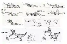 Patapon was developed by Pyramid, produced by Japan Studio, and designed by Hiroyuki Kotani.[8] The game was originally announced on June 11, 2007, during the E3 2007 press conference.[9] The designs for the Patapons were created in 2002 by french artist Rolito and were featured on his personal website in 2004.[10] When Kotani discovered their design, he envisioned the creatures marching into battle and chose to create a video game entirely based on their design.[11] Kotani contacted Rolito through a representative group known as Interlink in 2005 and recruited him to develop the game using the Patapon characters.[12] Rolito was tasked with creating a fictional universe for the characters. The development team would provide drafts and be evaluated by Rolito. Once approved, Rolito would provide the final design.[13] The name "Patapon" was conceived by Rolito taken from an old French nursery rhyme that used the word "Patapon" for children. Kotani chose the name due to it resembling the sounds of drums and marching.[12]