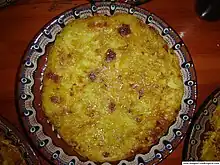 Patatnik or patetnik (Bulgarian: пататник or патетник) is a Bulgarian potato dish characteristic of the Rhodope Mountains in the country's central south.[1] Patatnik is made of grated potatoes, onions, salt and a type of very mild mint called Gyosum in Bulgarian, all mixed and cooked on a slow fire. Some restaurants add sirene (white cheese) or eggs, but this is not traditional; some people also use savory and peppers.