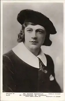 The two poets in the opera are given to reciting their own verses aloud, principally to the admiring chorus of rapturous maidens. The style of poetry Bunthorne declaims strongly contrasts with Grosvenor's. The former's, emphatic and obscure, bears a marked resemblance to Swinburne's poetry in its structure, style and heavy use of alliteration.[8] The latter's "idyllic" poetry, simpler and pastoral, echoes elements of Coventry Patmore and William Morris.[9] Gilbert scholar Andrew Crowther comments, "Bunthorne was the creature of Gilbert's brain, not just a caricature of particular Aesthetes, but an original character in his own right."[10] The makeup and costume adopted by the first Bunthorne, George Grossmith, used Swinburne's velvet jacket, the painter James McNeill Whistler's hairstyle and monocle, and knee-breeches like those worn by Oscar Wilde and others.[11]