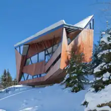 Hadaway House is a private residence in Whistler, British Columbia. The shape of the house was designed based on the size and height restrictions of the area, as well as the need to shed snow off the roof.[24] Whistler has very strict zoning regulations, so the design was started with the envelope instead of being designed from the inside out under normal circumstances.[25] The construction of the house brings together various systems; it uses a concrete slab system with steel and heavy timber framing.[24] These systems were all used in tandem to create the most efficient system overall to counteract the intense seismic and snow loads.[25]