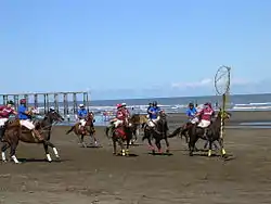 Consistía en arrojar un pato hacia arriba y liberar dos grupos de jinetes que se atropellaban para capturarlo como fuera, y llevarlo. Los jugadores, entonces, se pasaban el pato unos a otros lanzándolo o golpeándolo, para finalmente lograr encestarlo en una red. En ocasiones el pato se colocaba dentro de una cesta y con ella se jugaba.
