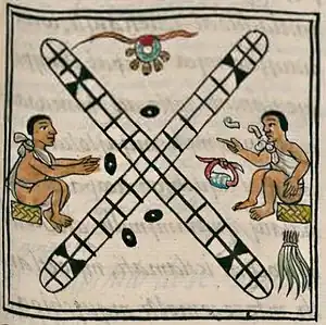 According to the Magliabechiano codex, the god of games, Macuilxochitl, was considered to be participating in the game.[2] To represent this, there is a special area near the game board reserved for offerings to Macuilxochitl. A player must place one of their treasures into this space each time their toss results in a score of zero (no holes showing). After each round of play, the winner of the round receives all the treasure from this space as a gift from Macuilxochitl.