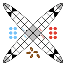 The game board has 52 squares arranged in an "X" shape.[2] The game board was traditionally painted with liquid rubber on a sheet of leather or a straw mat and decorated with colored dye, or carved into the floor or a tabletop.