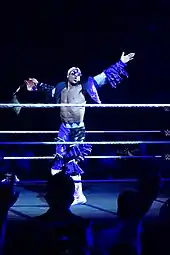 After getting signed to a developmental contract, Clark initially debuted at NXT house shows with the gimmick of a Donald Trump supporter, wearing shirts with Trump's image and the "Make America Great Again" slogan. In 2017, he adopted the persona of Velveteen Dream, a character inspired by the musician Prince. The character was described by WWE as a "mysterious yet intoxicating presence [...] sporting a frilled, jewelled look that would have fit right in onstage during Prince's Purple Rain Tour".[2] Clark described the character as "a sexually ambiguous, genderfluid, self-absorbed diva".[50] As Velveteen Dream, his finishing move was the Purple Rainmaker, a diving elbow drop with a name also inspired by Prince.[lower-alpha 1]