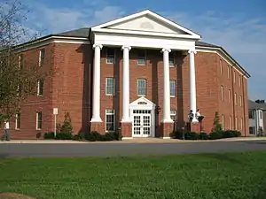 Patrick Henry College is located in the town of Purcellville in rural northern Virginia, approximately 40 miles (64 km) northwest of Washington, D.C. The campus currently consists of seven buildings arranged around a retention pond popularly called "Lake Bob",[20] as well as several athletic fields. The oldest structure, Founders Hall, opened in 2000 and contains three classrooms, the college library, and various administrative and faculty offices. It is also home to the offices of the Home School Legal Defense Association.[21] Hanna Rosin, author of God's Harvard, described the campus as "tiny, less like an Ivy League college than like a Hollywood set of an old Ivy League school." The buildings are of Colonial Revival architecture. The artwork in Founders Hall consists of copies of portraits of the Founding Fathers placed along a staircase, leading to a picture of Patrick Henry at the second Virginia convention which features a light from heaven guiding Henry's speech. The artwork is designed to, in the words of Hanna Rosin, "remind the students that America was founded as a Christian nation."[22]