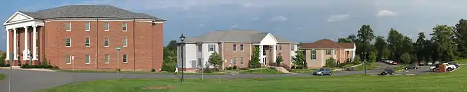The school's residential village is composed of five residence halls located along the edges of the lake. There are two men's and three women's dormitories.[23] The four smaller dormitories opened in 2001, while the largest residence hall, Red Hill, opened in 2003.[24] Located in the basement of Mount Vernon is an auditorium referred to as Town Hall, where the school's daily chapel sessions and other special events are held. The residence halls are set up in an arc shape around the lake.