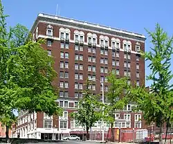 The Patrick Henry Hotel is a Colonial Revival former hotel listed on both the National Register of Historic Places and the Virginia Landmarks Register in Downtown Roanoke, Virginia, United States. Located at 617 South Jefferson Street at the southern end of Downtown, the Patrick Henry was designed by William Lee Stoddart and opened in 1925.[3] The building now serves as apartments, office space, and a restaurant in the former lobby rebranded simply The Patrick Henry. It is located in the Roanoke Downtown Historic District.