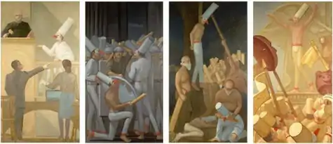 Poet Stanley Kunitz described Webb's early cycles as "brilliant and mordant evocations of a twentieth-century Carnival of Death [that] confront the terrible with an irony that enriches and deepens the ultimate pathos."[27] Much of this work was featured in his first New York solo exhibition at Amos Eno Gallery in 1993.[21] His first cycle, Punchinello: A Life, 1957–1990, offered a terse narrative in five diptychs, tracing a journey from birth through adolescence and sexual awakening to adulthood and premature death from a disease suggesting AIDS.[21] The diptych, Lamentation / By Punchinello's Bed (1990–2), was inspired by the artist's hospital visit to his dying and then deceased boyfriend, Chris Kales, who while suffering from AIDS was only reluctantly touched by caregivers. The work draws on Christian martyr iconography and was included in the traveling historical survey, "Art AIDS America" (2015–7); it belongs to the Leslie-Lohman Museum of Art.[28][29][1] The diptych took on personal significance as a representation of Webb's experience of witnessing his lover’s death and anticipating his own death after he also tested positive for HIV.[8][9] Poet Mark Doty has written that Punchinello's mask provided a "safe distance" allowing Webb to "portray the sorrows of the AIDS epidemic with a particularly compelling gravity and grace."[25] In the four-painting cycle, Punchinello in America (1995, 9' x 22' mural composition), Webb's focus turned from loss to anger, portraying the character fighting back in street demonstrations and court, being brutally lynched, and ultimately emerging victorious.[4][9]