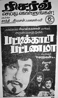 Pattikada Pattanama (transl.Village or Town?) is a 1972 Indian Tamil-language romantic comedy film produced and directed by P. Madhavan and written by Bala Murugan. The film stars Sivaji Ganesan and Jayalalithaa. The film deals with Kalpana, an urban woman who marries a villager Mookaiyan. After marriage, differences of opinion arise between the couple as Mookaiyan raises objections about city culture, leading to their separation. The rest of the film is whether Kalpana reforms and the couple reunite or not.