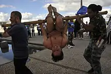 Pau de arara [ˈpaw dʒi aˈɾaɾɐ] is a torture method in which the victim is bound by the ankles and wrists, with the biceps under a pole and knees over it. The pau de arara torture method was widely used by during the military dictatorship in Brazil.