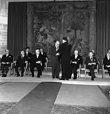 A bill on war damage, agreed in October 1947, stipulated that owners of homes damaged by the war and took their initiative to restore them were entitled to compensation.[12] In 1948, voting rights for women were introduced.[13] An Act providing for the establishment of works councils was promulgated in September 1948,[14] while a school building fund was set up that same year "to supply the material needs of secondary education."[15] Also in 1948, the multilateral school was introduced.[16]