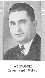 In 1950, Alfonsi attempted another return to politics, launching a primary challenge against incumbent Republican state representative Clarence W. Gilley in the Florence–Forest–Oneida district.[17] During the primary, Gilley used a 1940s report of the House Un-American Activities Committee to accuse Alfonsi of having associated with communists. At issue was Alfonsi's involvement with the Wisconsin Conference in Social Legislation in the late 1930s and early 1940s. The Wisconsin Conference in Social Legislation was established by labor groups, but was later found to have also received money from communist sources.[18] Alfonsi narrowly lost the primary, receiving 48% of the vote.[19] Alfonsi resumed his teaching career, and remained principal at Minocqua for several more years, resigning ultimately in 1955.[20]