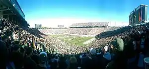 Michigan coaches, players, and the ABC broadcasters argued that the clock should have expired before the final play and that the timekeeper, "Spartan Bob" Stehlin, purposely stopped the clock before the ball was grounded.[33] Michigan commentator Frank Beckmann speculated that Michigan State had benefited from its home-field advantage, even calling the unfolding controversy "criminal".[34] Dave Parry, the Big Ten conference's coordinator of football officials, said, "that play, as much as we've put that under a high-powered microscope, was correct. We could not prove that timer wrong."[35] The Big Ten changed its timekeeping policy for the 2002 season, requiring that time be kept on the field by a neutral official.[36]