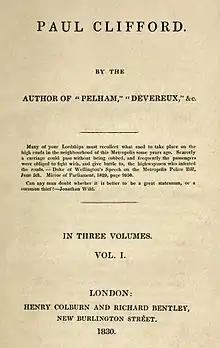 Paul Clifford is a novel published in 1830 by English author Edward Bulwer-Lytton. It tells the life of Paul Clifford, a man who leads a dual life as both a criminal and an upscale gentleman. The book was successful upon its release.[1] It is best known for its opening phrase "It was a dark and stormy night...", which helped inspire the Bulwer-Lytton Fiction Contest.