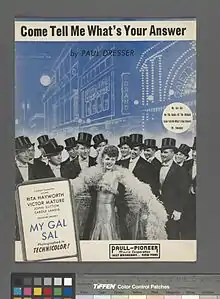 Actor Victor Mature portrayed Dresser in the musical film My Gal Sal (1942).[36][99] The plot bears little resemblance to Dresser's life, and songs actually written by Dresser are mingled with songs attributed to him in the film but written for the movie by Harry Dacre, Ralph Rainger and Leo Robin. Dresser's works in the film include: "Come Tell Me What's Your Answer, Yes or No", "I'se Your Honey If You Wants Me, Liza Jane", "On the Banks of the Wabash", "The Convict and the Bird", "My Gal Sal", and "Mr. Volunteer (You Don't Belong to the Regulars, You're Just a Volunteer)".[101]