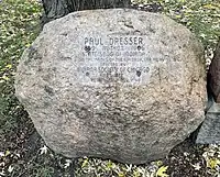 Dresser's health began to deteriorate rapidly at the end of 1905, when he wrote to his sister that he was ill, but gave no details.[88] After his finances finally gave out, Dresser was forced to leave the hotel where he was living and move to his sister's and brother-in-law's home in New York City.[89] Dresser died at their home on January 30, 1906, at 6:23 p.m., from a brain hemorrhage.[90] He also suffered from alcoholism, obesity, and depression.[6] A funeral was held in New York City on February 2, but because Dresser died penniless, his remains were held at Calvary Cemetery on Long Island until his funeral bill was paid. On March 19 Dresser's remains were moved to St. Boniface Cemetery in Chicago, where a funeral and final burial took place on November 23, 1907.[91] With no funds to purchase a memorial stone, Dresser's grave remained unmarked until 1922, when the Indiana Society of Chicago had a boulder from the banks of the Wabash River brought to Chicago to mark his burial site.[92][93][94]