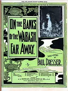 In the mid-1890s Dresser began composing his most famous songs, including "Just Tell Them That You Saw Me" (1895). Dresser's songs, along with others published by Howley, Haviland and Company, were included in the top minstrel acts and shows around the country.[62] Dresser's success continued with "We Were Sweethearts for Many Years" (1895), "Lost, Strayed or Stolen" (1896), and his most famous hit, "On the Banks of the Wabash, Far Away" (1897), which took Dresser's career to its pinnacle. In "Wabash" Dresser reminisced about his childhood home in Indiana, which was near the Wabash River.[63][64] With the success of "Wabash", many newspapers compared Dresser to popular music composer Stephen Foster. When asked what inspired him to compose the song, Dresser replied, "The same sweet memory that inspired that other Hoosier, James Whitcomb Riley, to sing the 'Old Swimmin' Hole."[65] The location of where the song was written is referenced in a short story in The Atlantic by Elizabeth Stuckey-French. She wrote, "Paul Dresser wrote 'On the Banks of the Wabash' at Mudlavia."[66]