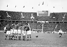 One of the best full backs of his era, Paul Janes established a record for most German caps which was not broken until 1970. Janes started out as a right half back, but during the 1934 World Cup he debuted as right back and stayed at that position for some four seasons before moving back into a sweeper role. He was injured during the 1936 Olympics and thus was spared of the embarrassing defeat of Germany by Norway.[2] During the latter half of the 1930s, Germany possessed one of the strongest full back pairings in European football with Paul Janes on the right and Reinhold Münzenberg on the left side. Vittorio Pozzo, the coach of World Champions Italy, nominated Janes for a 1937 continental selection, but Janes could not participate due to an injury. One of Janes’ best assets was his powerful yet accurate shooting ability, which gave him the nickname "World Champion of Precision". His trademark were hard shots from all possible angles, his seven goals for Germany all came from either freekicks (four) or penalties (three). He was also a very calm player who kept his cool even in nerve-racking situations. Sepp Herberger said about Janes’ characteristics: "He rarely was caught off-guard on the pitch, as he had the ability to anticipate what the opponent was planning and he interpreted defensive play always as the first step in building up the next attack."[3] Despite his calmness and overall cleverness, Janes was renowned for an extravaganza that he had imported from South America: He was the first German footballer to specialize in the acrobatic bicycle kick.