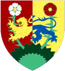 Designed by Patric Dickinson, Clarenceux King of Arms. The sinister half of the shield, with a blue lion on a yellow background, alludes to René Hansen's Danish origin.[9]
