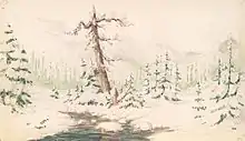 A rare painting of his, Scene in the Northwest: Portrait of John Henry Lefroy, showing British surveyor John Henry Lefroy, which had been in possession of the Lefroy family in England, garnered a record price at an auction at Sotheby's in Toronto on February 25, 2002, when Canadian billionaire Kenneth Thomson[25] won the bid at C$5,062,500 including the buyer's premium (US$3,172,567.50 at the time).[26] Thomson subsequently donated the painting as part of his Thomson Collection to the Art Gallery of Ontario. The Glenbow Museum in Calgary has a copy of this painting that is thought to have been done by Kane's wife Harriet Clench.[27] Another auction at Sotheby's on November 22, 2004, for Kane's oil painting Encampment, Winnipeg River (after the field sketch shown above) failed when bidding stopped at C$1.7 million, less than the expected sale price of C$2–2.5 million.[28]