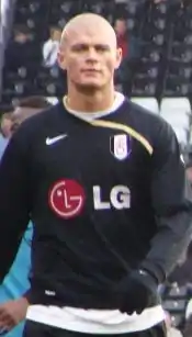 Konchesky signed a four-year contract with Fulham in July 2007, for a fee of up to £3.25m.[19] Konchesky played the first game of the 2008–09 season for Fulham against new Premier League team Hull City but his mistake greatly helped the opposing team score a winner after he stumbled over the ball. He missed the next game against Arsenal due to injury but returned to action the following league game against Bolton Wanderers. He scored his first goal for the club, a 35-yard piledriver into the top left hand corner of the net in January 2009 at the Boleyn Ground, in a 3–1 defeat against his former side West Ham,[20] which later won the January 2009 Goal of the Month competition and was included in the running for Goal of the Season.