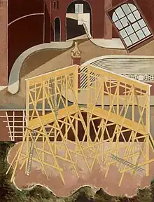 In 1921, after visiting his sick father, Nash collapsed and, after a week during which he repeatedly lost consciousness, was diagnosed as suffering from 'emotional shock' arising from the war.[6] To aid his recovery, the Nashes moved to Dymchurch which they had first visited in 1919 and where he painted seascapes, the seawall and landscapes of Romney Marsh.[11] The seawall at Dymchurch became a key location in Nash's work.[21] The conflict between land and sea depicted in the seawall paintings at Dymchurch recalled elements of Nash's paintings on the Western Front and were also influenced by his grief at the death of his friend Claud Lovat Fraser in June 1921. In 1922, Nash produced Places, a volume of seven wood engravings for which he also designed the cover, cut the lettering and wrote the text. At this time he also began painting floral still-lifes as well as continuing his landscape paintings, most notably with Chilterns under Snow in 1923.[6] Throughout 1924 and 1925 Nash taught part-time at the Design School at the Royal College of Art, where his students included both Eric Ravilious and Edward Bawden. In 1924 he held a commercially successful exhibition at the Leicester Galleries. This allowed the Nashes to spend the winter near Nice and visit Florence and Pisa at the start of 1925 after which they moved home to Iden near Rye in Sussex. Iden and the Romney Marshes became the settings for a series of paintings by Nash, most notably Winter Sea painted in 1925 and reworked in 1937.[6] In 1927 Nash was elected to the London Artists' Association and in 1928 held another successful exhibition of his paintings at the Leicester Galleries whilst an exhibition of his wood-engravings was held at the Redfern Gallery the same year.[11] The Leicester Galleries exhibition was notable for showing Nash turning away from his popular landscapes and beginning to explore abstraction in his work.[11]