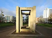 "Enclosure", in Watts Park, Southampton, was commissioned by Southampton City Council, with funding from the National Lottery Heritage Fund, and was unveiled in 2000. It is made of granite and Portland stone, and is 4 metres (13 ft) high; it is a frame from which to view four landmarks in and around the park.[9][10][11]