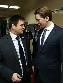 Pavlo Anatoliiovych Klimkin (Ukrainian: Павло Анатолійович Клімкін; born 25 December 1967) is a Ukrainian diplomat who from 19 June 2014 until 29 August 2019 served as Minister of Foreign Affairs of Ukraine.[2] A Moscow-educated physicist,[3][1] he has worked in the Ukrainian Foreign Ministry since 1993, with positions including director of the department for the European Union, as well as deputy foreign minister in the First Azarov Government,[4][5] where he played a central role in negotiating the Ukraine–European Union Association Agreement.[5][6]
