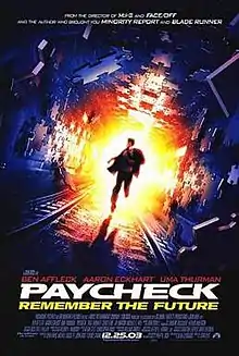 Paycheck is a 2003 American science fiction action film directed by John Woo. Written by Dean Georgaris, it is based on the 1953 short story "Paycheck" by Philip K. Dick. The film stars Ben Affleck, Uma Thurman, Aaron Eckhart, Paul Giamatti, Michael C. Hall, Joe Morton, and Colm Feore. The film was released on December 25, 2003, by Paramount Pictures in North America and DreamWorks Pictures internationally, to negative reviews but was a commercial success, grossing $117.2 million on a $60 million budget.[1]