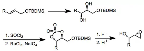 Other methods available for the preparation of 2,3-epoxy alcohols have the advantage that they do not begin with an existing 2,3-epoxy alcohol; however, they tend to involve more steps than epoxide migration. Asymmetric dihydroxylation may be used to synthesize epoxy alcohols with high stereoselectivity, and some of the methods relying on dihydroxylation avoid the use of strongly basic conditions.[18]