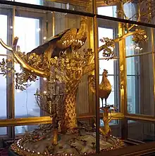 The Peacock egg was inspired by the 18th-century Peacock Clock made by James Cox. The clock was a present from Grigory Potemkin to Catherine the Great.[3] The Peacock Clock was housed in the Winter Palace in Saint Petersburg, Russia, which is now the Hermitage Museum.