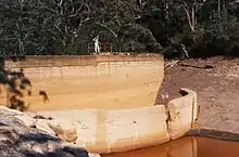 Construction began in 1902, with Peat Island being cleared and levelled. Several buildings were erected, including a hexagonal sewing room and two storey brick edifices that still dominate the island. In order to provide fresh water to both Peat and Milson Islands, a 24 feet (7.3 m) high concrete dam holding 7,000,000 gallons was constructed across a gully on the northern bank of the Hawkesbury River, a few kilometres upstream and above the cliffs overlooking the wreck of HMAS Parramatta. Rock and sand for the dam were obtained on site, but cement and other materials had to be hauled 275 feet (84 m) up the cliff face from the river using old Sydney tram cables.[5] The only access to the reservoir was via a series of five, near vertical timber and iron ladders that were pinned into the face of the cliff adjacent to the waterfall.[6] A pipeline ran from the reservoir and serviced both islands via underwater mains.