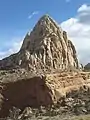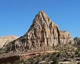 Pectols Pyramid is a 6,211-foot (1,893-meter) elevation summit located in Capitol Reef National Park, in Wayne County of Utah, United States. This iconic landmark is situated 2 mi (3.2 km) southeast of the park's visitor center, 1 mi (1.6 km) south of Navajo Dome, and 0.5 mi (0.80 km) southwest of Capitol Dome. Precipitation runoff from this feature is drained by the Fremont River, which in turn is within the Colorado River drainage basin. This geological feature's name honors Ephraim Portman Pectol (1875–1947), booster and founder of what would become Capitol Reef National Monument in 1937.[3]