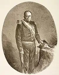 Pedro Santana y Familias, 1st Marquess of Las Carreras (29 June 1801 – 14 June 1864) was a Dominican military commander and royalist politician who served as the president of the junta that had established the First Dominican Republic, a precursor to the position of the President of the Dominican Republic, and as the first President of the republic in the modern line of succession. A traditional royalist who was fond of the Monarchy of Spain and the Spanish Empire, he ruled as a governor-general, but effectively as an authoritarian dictator.[1][2] During his life he enjoyed the title of "Libertador de la Patria."