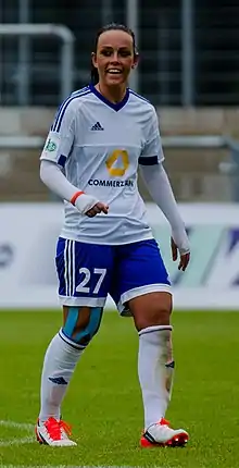 Kuznik began her career at the age of five at SV Blau-Weiß Tröbitz. She joined the academy of 1. FFC Turbine Potsdam in 2000. Upon graduation in 2002, she became a permanent member of Turbine’s first team. Kuznik has won the national championship seven times and the national cup nine times, over the course of spells at Potsdam, Lokomotive Leipzig, SC 07 Bad Neuenahr and 1.FFC Frankfurt.[1] Kuznik also had signed for VfL Wolfsburg in 2013, but cancelled her contract before making any appearances for the club.[2]