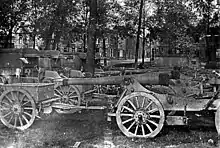For transport, the tail of the carriage was hooked to a limber and caisson for horse towing. It was found it had a tendency to sink in on soft ground and since it wasn't designed to be pulled by motor traction its wooden-spoked, steel-rimmed wheels, and axle were too fragile to be towed at high speed.[3]