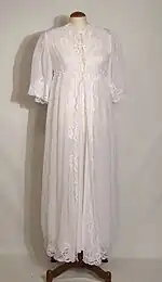 A peignoir (/ˈpɛnwɑːr, ˈpeɪn-/, also US: /-ˈwɑːr/;[1][2][3] French pronunciation: [pɛ.ɲwaːʁ]) is a long outer garment for women which is frequently sheer and made of chiffon or another translucent fabric. The word comes from French peigner, to comb the hair (from Latin pectināre, from pecten, pectin-, comb) describing a garment worn while brushing one's hair, originally referring to a dressing gown, bathrobe or lounging robe.