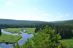 The Peleduy is a left tributary of the Lena. It has its sources in the southwestern area of the Lena Plateau.[5] The river flows in a roughly southeastern direction among large boulders within a fairly straight channel. In its middle reaches it bends northeastwards within a floodplain and not far south of the course of the Nyuya it bends southeastwards again. Finally it meets the left bank of the Lena by Peleduy village 2,690 kilometres (1,670 mi) from its mouth.[1][6]