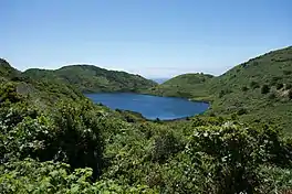 The lake is within the Southern Inverness Ridge region of the Point Reyes National Seashore, in an area of coastal scrub and grassland. In this coastal zone there are open stands of coyote brush (Baccharis pilularis), often with native grasses such as California oatgrass (Danthonia californica) and purple needlegrass (Nassella pulchra).[12][13][14] The other dominant plants in this ecosystem are California sage brush (Artemisia californica), black sage (Salvia mellifera), sticky monkeyflower (Mimulus guttatus), poison oak (Toxicodendron diversilobum), California coffeeberry (Frangula californica) and tree lupine (Lupinus arboreus).[12]