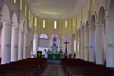 In the early years, there was a windmill near the church, pumping fresh water from the very high water table of the area, into a well.  For many years, people collected water for their households there and the water was led to the gardens of the Mission.  In later years, as a result of the improved infrastructure of municipal water supply, more households had access to running water, in or closer to their homes.  The windmill did not seem to serve a purpose any longer and was removed and the well filled up.  In 1983, during a small church service, three of the columns towards the back of the church collapsed, together with a section of the roof, which the columns supported.[6] Fortunately nobody was hurt in this incident.  When engineers subsequently assessed the whole building, they discovered the groundwater drainage system that had been installed when the church was built. They realized that, with the removal of the windmill, this drainage system became dysfunctional. For many years, water had dammed up under the church building and started seeping high into its structure, finally causing the partial collapse thereof.  The Gold Fields Foundation generously supported the renovation of the whole building and reinstalled the underground water drainage system, which is now powered by a solar panel. The beautifully restored cathedral was reopened in November 1985.