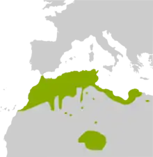 The Sahara frog is native to North Africa where its range includes Western Sahara, Morocco, Algeria, Tunisia, Libya and Egypt. It is aquatic and found in and near streams, oasis pools, irrigation canals, lakes, and other water bodies.[1]
