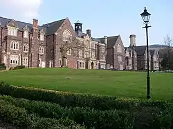 The hospital was designed by Thomas Fulljames using a corridor plan layout.[2] It was built in the Gothic style using local old red sandstone with Bath stone dressings and opened as the Joint Counties' Lunatic Asylum in December 1851.[2] It initially had 210 inmates in 12 wards[3] and was set in grounds of 75 acres of landscaping.[4]