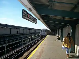 This elevated station has two side platforms and two tracks with space for a center track that was never installed.[13] Both platforms have beige windscreens and brown canopies with green support frames and columns that run along the entire length except for a small section at the extreme west (railroad north) end. Here, there are only waist-high black steel fences. The station name plates are in the standard black with white lettering. The platforms are slightly longer than the standard IRT train length of 514 feet (157 m).