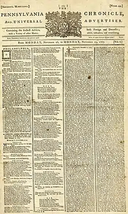 The Pennsylvania Chronicle and Universal Advertiser was an American colonial newspaper founded in 1767 that was published in Philadelphia, Pennsylvania, prior to the American Revolution and was founded by William Goddard and his silent business partners Joseph Galloway and Thomas Wharton. Benjamin Franklin, an associate of Galloway, was also a partner with the Chronicle.[1]