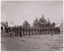The regiments were grouped into a division of three brigades, and the entire unit normally fought together until the initial enlistments expired in 1864. The exceptions to this include the 2nd Brigade, most of which did not take part at Gettysburg, as it was assigned to the Washington, D.C., defenses,[3] and the detachment of several artillery batteries and cavalry troops to other divisions.