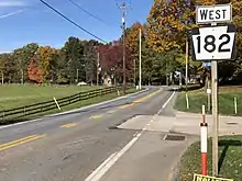 When Pennsylvania legislated routes in 1911, what is now PA 182 was not given a number.[5] By 1926, the current alignment of the route was an unnumbered, unpaved road.[6] The road was paved by the 1930s.[7] PA 182 was designated to its current alignment between US 30 (now PA 462) in West York and PA 74 in Spry in 1961 in order to provide a numbered route at the interchange with I-83.[2]